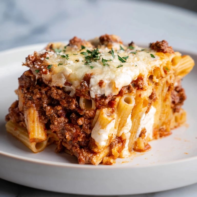 A comforting Italian-American pasta casserole featuring tender ziti, a rich meat sauce, and gooey melted cheeses—perfect for family dinners or gatherings.