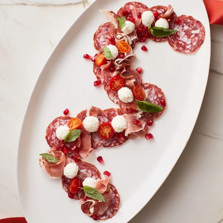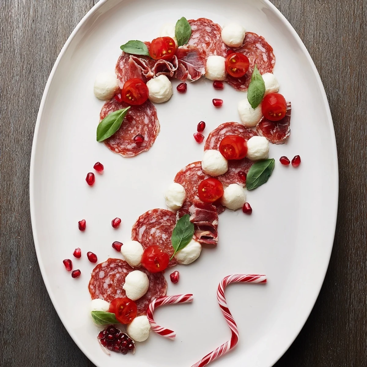Arrange alternating slices of mozzarella cheese and salami in a sweeping curved S-shape on a large serving board to mimic a candy cane’s stripes.
