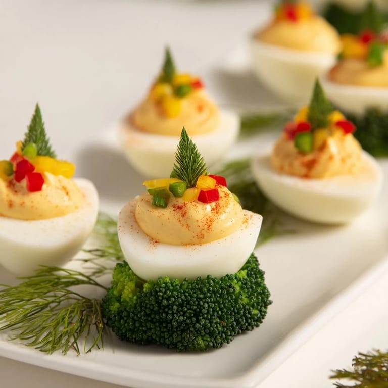- Decorate the deviled eggs: Sprinkle finely diced red and yellow bell pepper and green onion over the eggs as ornaments. Place broccoli floret at the base for the tree trunk. Garnish with dill sprigs to resemble pine branches if desired. Add a few pomegranate seeds for extra festive color if using. Lightly dust with extra smoked paprika for color.
