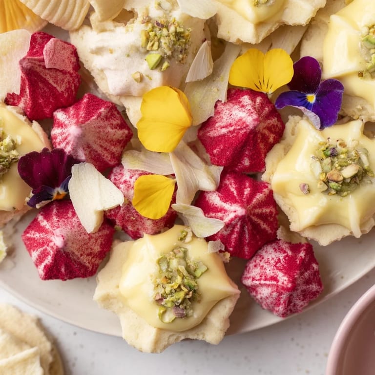 To ensure the perfect texture in your mini lemon shortbread cookies, avoid overmixing the dough once the flour is added. When piping the raspberry meringue kisses, use a fine tip to create uniform shapes. Gently melt the white chocolate to prevent seizing and cool it in a single layer on parchment to achieve clear, crisp bark shards. For the pistachio tartlets, chill the filling briefly if it softens too much while assembling.