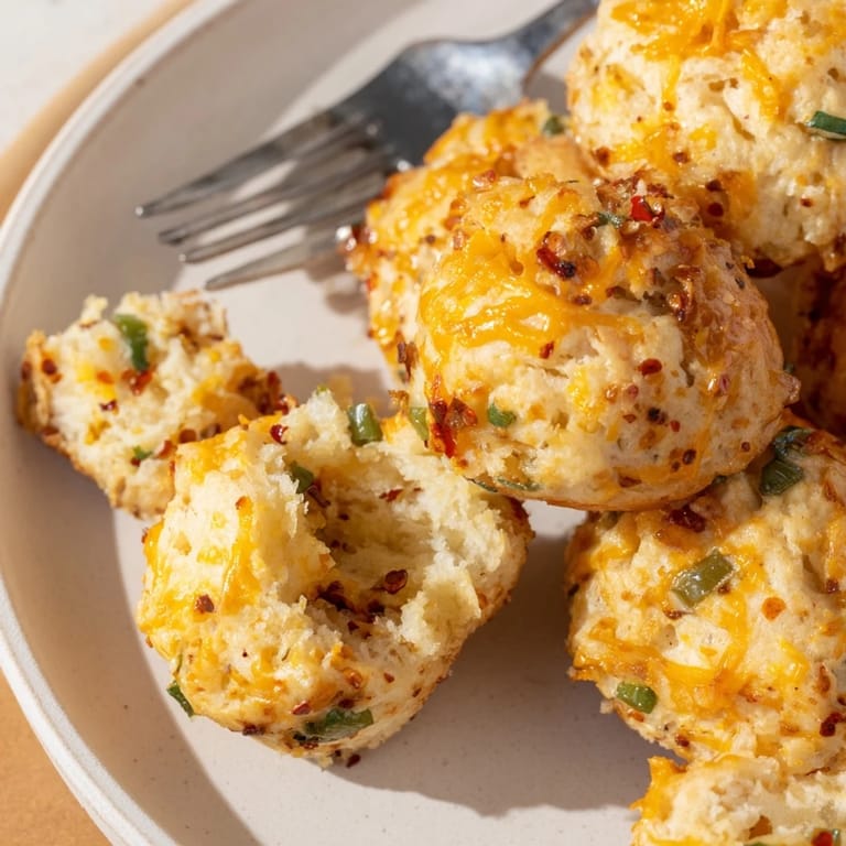 Save Fluffy, savory biscuit balls loaded with cheddar, fresh jalapeños, and a kick of chili-garlic flavor are baked in muffin form for a perfect party snack or breakfast treat.