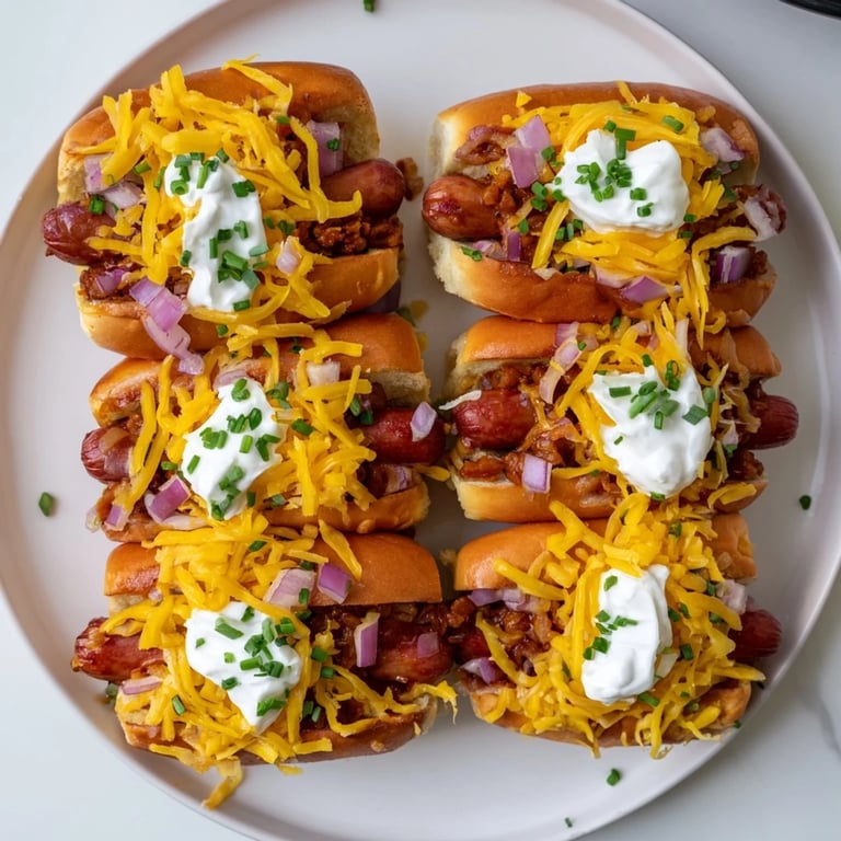 This comforting baked dish layers sliced beef hot dogs, prepared chili, and shredded cheddar cheese over toasted bread halves, seasoned with butter and garlic powder. Baked until bubbly and golden, it’s perfect for quick weeknight dinners or gatherings. Garnished with fresh chives and sour cream options add fresh notes and creaminess.