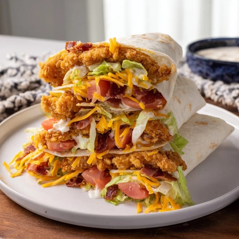 Save Experience the crunchy goodness of crispy chicken strips paired with savory bacon, fresh veggies, and creamy ranch, all wrapped in a warm tortilla. Its a flavor explosion in every bite!