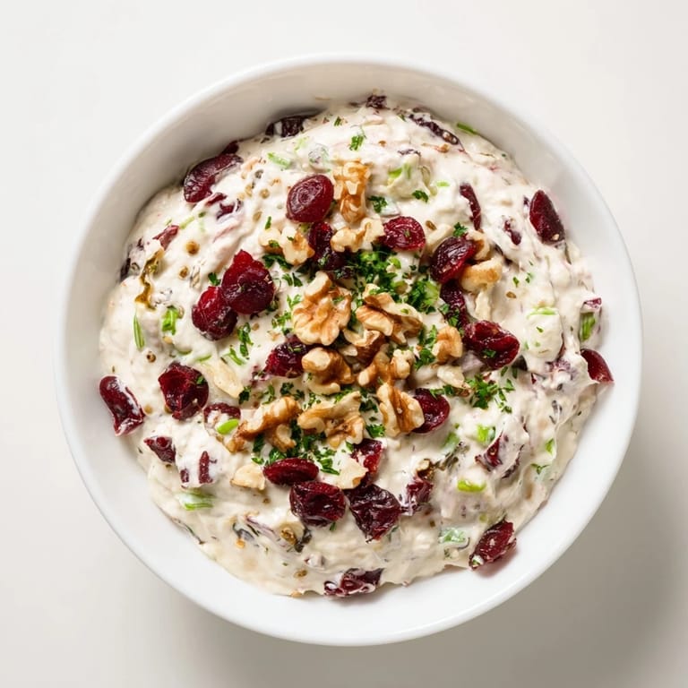 Save A festive, creamy dip made lighter for guilt-free holiday snacking, featuring tangy cream cheese, Greek yogurt, and bursts of cranberry and herbs.