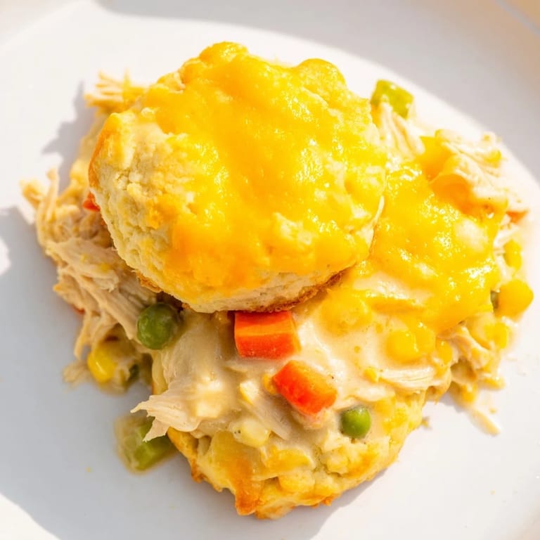 Save A comforting, savory casserole featuring tender chicken and vegetables in a creamy sauce, topped with golden, cheesy cheddar biscuits, all baked together in one pan for easy cleanup.